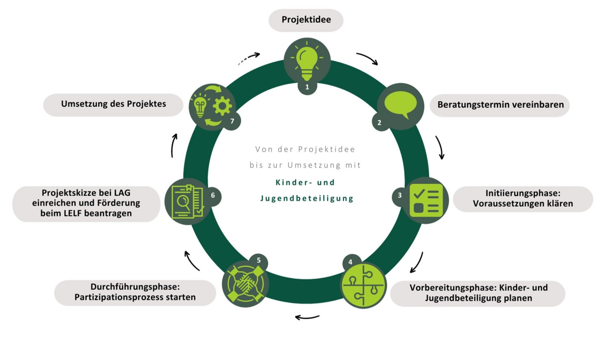 Das Ziel besteht darin, Projektträger*innen zu motivieren und ihnen praktische Unterstützung anzubieten, damit sie jungen Menschen die Möglichkeit zur Mitsprache und Mitbestimmung in ihren Projekten geben können. Hierfür haben die Projektträger*innen die Chance, gemeinsam mit der LAG und dem von ihr beauftragten Dienstleister ein maßgeschneidertes Beteiligungsverfahren für ihr Projekt vor der Einreichung ihres LEADER-Antrags zu entwickeln. Um Kinder und Jugendliche zu beteiligen, sieht das Projekt den folgenden Ablauf vor: